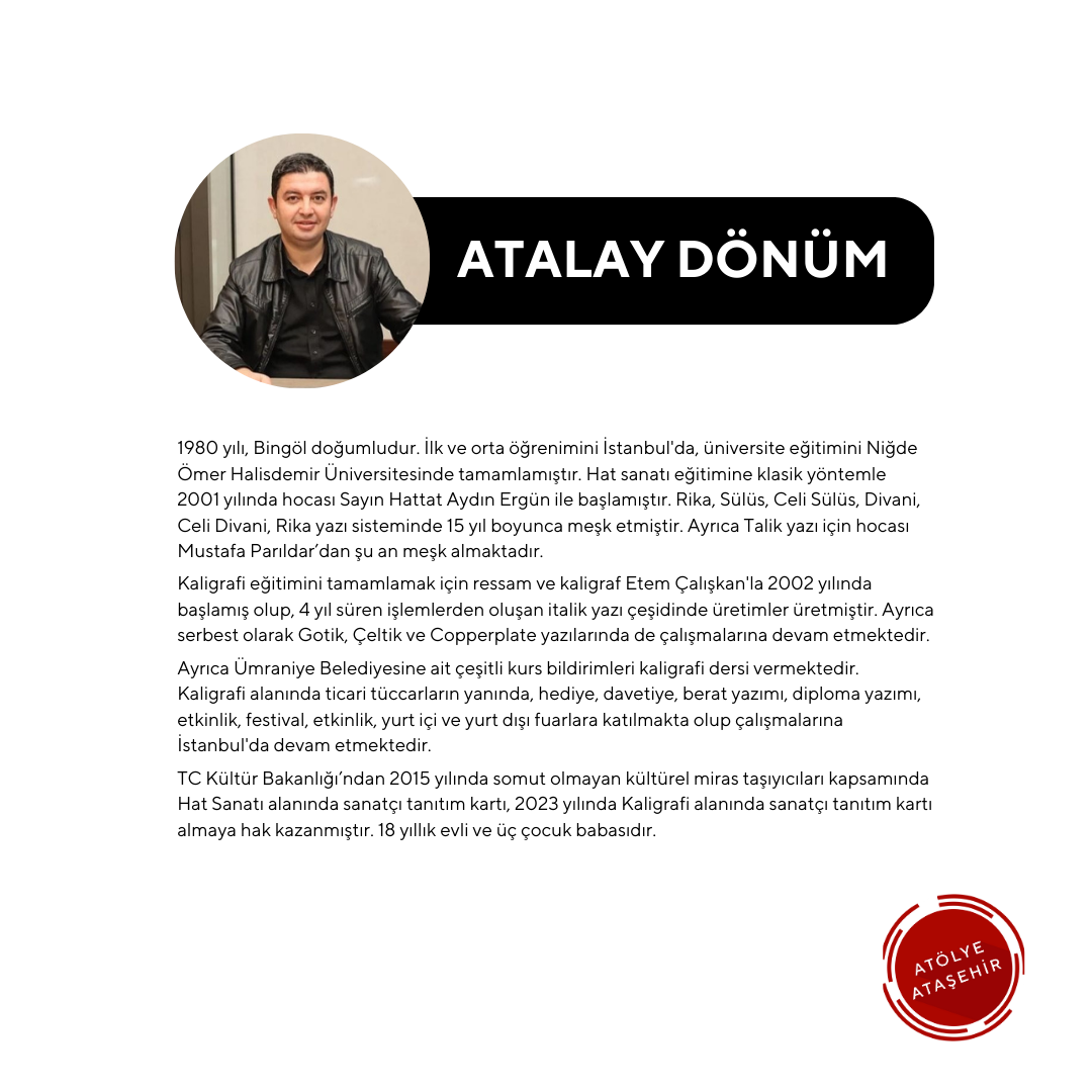 Atalay Dönüm 1980 yılı, Bingöl doğumludur. İlk ve orta öğrenimini İstanbul'da, üniversite eğitimini Niğde Ömer Halisdemir Üniversitesinde tamamlamıştır. Hat sanatı eğitimine klasik yöntemle 2001 yılında hocası Sayın Hattat Aydın Ergün ile başlamıştır. Rika, Sülüs, Celi Sülüs, Divani, Celi Divani, Rika yazı sisteminde 15 yıl boyunca meşk etmiştir. Ayrıca Talik yazı için hocası Mustafa Parıldar’dan şu an meşk almaktadır.