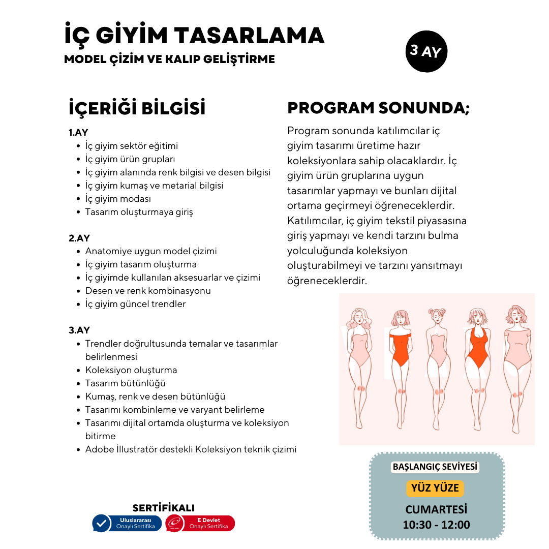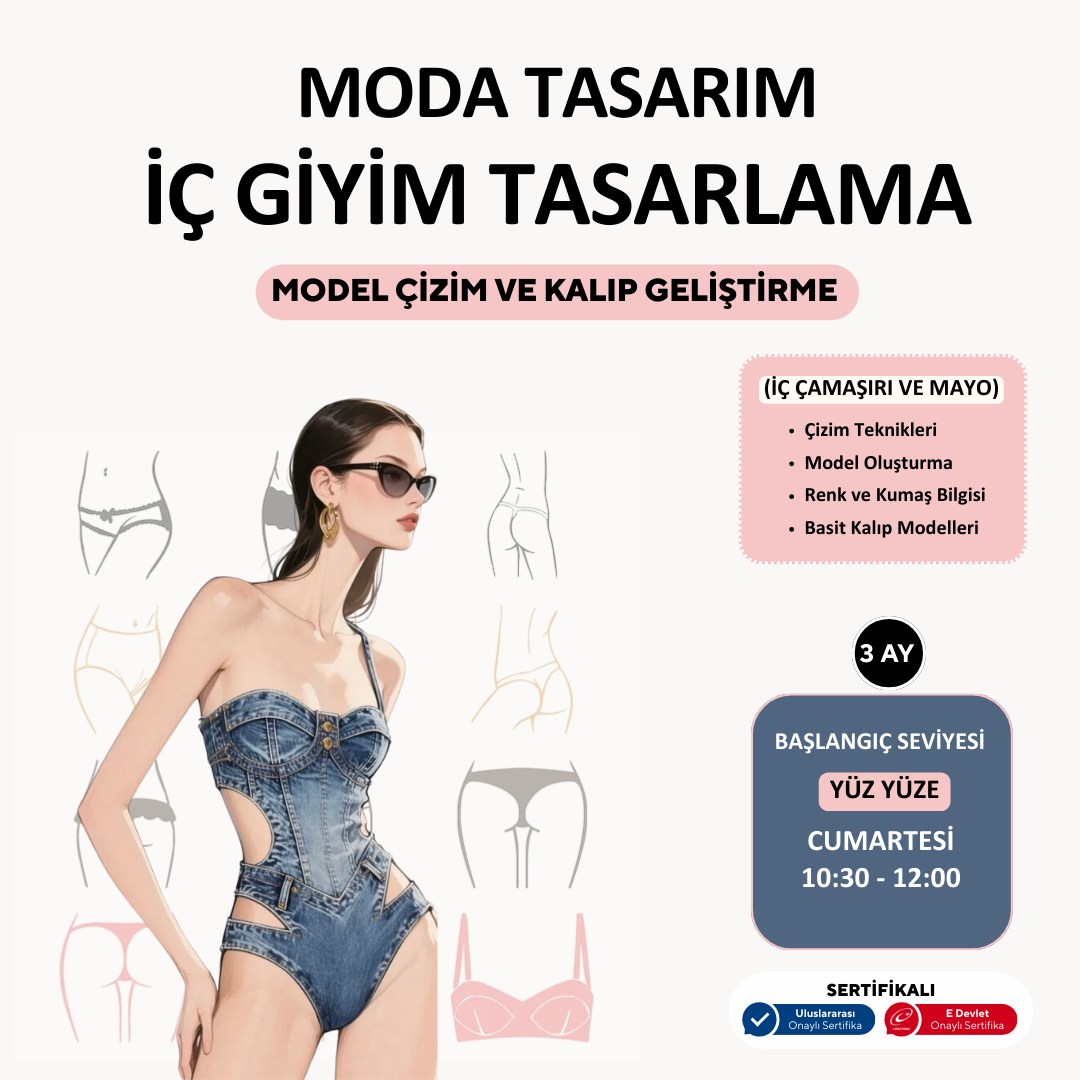 Die Teilnehmer lernen, Dessous- und Bademodenkollektionen zu entwerfen. Sie beherrschen Zeichen-, Farb- und grundlegende Schnitttechniken. Sie können beeindruckende Modeillustrationen erstellen, indem sie die Tricks des Zeichnens von Unterwäschemodellen für verschiedene Körpertypen erlernen.