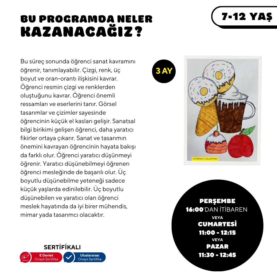 Am Ende dieses Prozesses lernen die Schüler den Kunstbegriff kennen und definieren ihn. Sie verstehen die Zusammenhänge zwischen Linie, Farbe, Dreidimensionalität und Proportionen. Die Schüler verstehen, dass Malerei aus Linien und Farben besteht. Sie lernen bedeutende Künstler und ihre Werke kennen. Visuelle Gestaltung und Zeichnungen entwickeln die Handmuskulatur. Schüler, die künstlerisches Wissen entwickeln, entwickeln kreativere Ideen. Schüler, die die Bedeutung von Kunst und Design verstehen, haben auch eine andere Lebensperspektive. Schüler lernen kreativ zu denken. Wer kreativ denkt, ist im Beruf erfolgreich. Die Fähigkeit zum dreidimensionalen Denken kann erst in jungen Jahren erworben werden. Schüler, die dreidimensional denken und kreativ sind, werden im Berufsleben erfolgreiche Ingenieure, Architekten oder Designer.