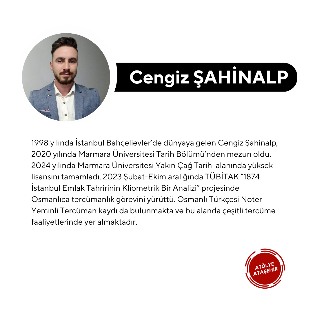 Born in 1998 in Bahçelievler, Istanbul, Cengiz Şahinalp graduated from Marmara University, Department of History in 2020. He is registered as a Notary Sworn Translator in Ottoman Turkish and has made various translations in this field. Between February 2023 and October 2023, he worked as an Ottoman translator in the TÜBİTAK project "A Cliometric Analysis of the 1874 Istanbul Real Estate Tax Calculation". He is currently continuing his master's degree in Modern History at Marmara University. He is working on the subject of "The Life and Administrative Career of Muhsinzade Abdullah Pasha" in his thesis.