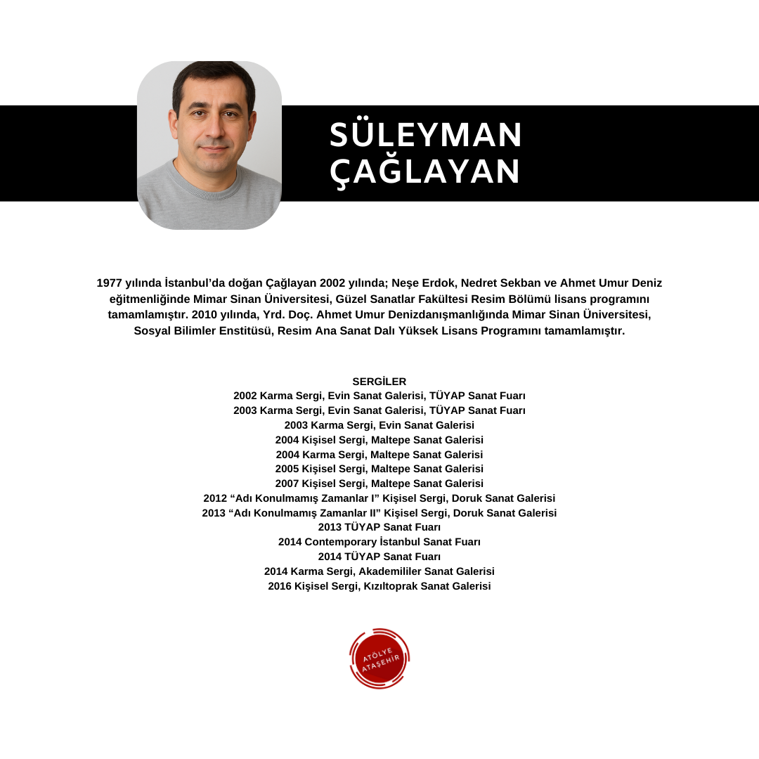 Born in Istanbul in 1977, Çağlayan completed his undergraduate program in the Painting Department of the Faculty of Fine Arts at Mimar Sinan University in 2002 under the tutelage of Neşe Erdok, Nedret Sekban and Ahmet Umur Deniz. In 2010, he became an Assoc. He completed the Master's Program in Painting at Mimar Sinan University, Institute of Social Sciences, under the supervision of Ahmet Umur Deniz. EXHIBITIONS 2002 Group Exhibition, Evin Art Gallery, TÜYAP Art Fair 2003 Group Exhibition, Evin Art Gallery, TÜYAP Art Fair 2003 Group Exhibition, Evin Art Gallery 2004 Personal Exhibition, Maltepe Art Gallery 2004 Group Exhibition, Maltepe Art Gallery 2005 Personal Exhibition, Maltepe Art Gallery 2007 Personal Exhibition, Maltepe Art Gallery 2012 "Unnamed Times I" Personal Exhibition, Doruk Art Gallery 2013 "Unnamed Times II" Personal Exhibition, Doruk Art Gallery 2013 TÜYAP Art Fair 2014 Contemporary Istanbul Art Fair 2014 TÜYAP Art Fair 2014 Group Exhibition, Akademililer Art Gallery 2016 Personal Exhibition, Kızıltoprak Art Gallery