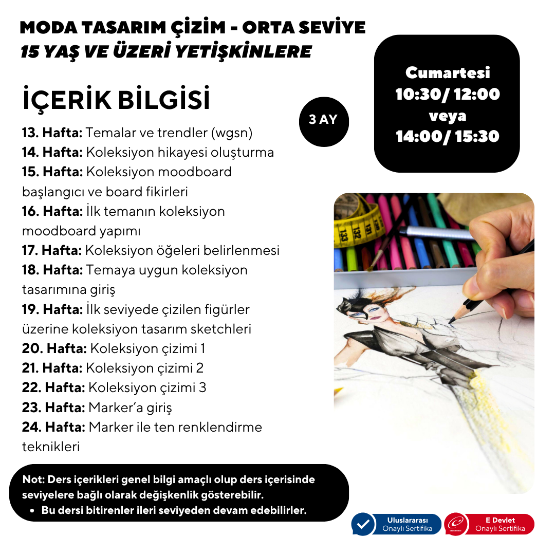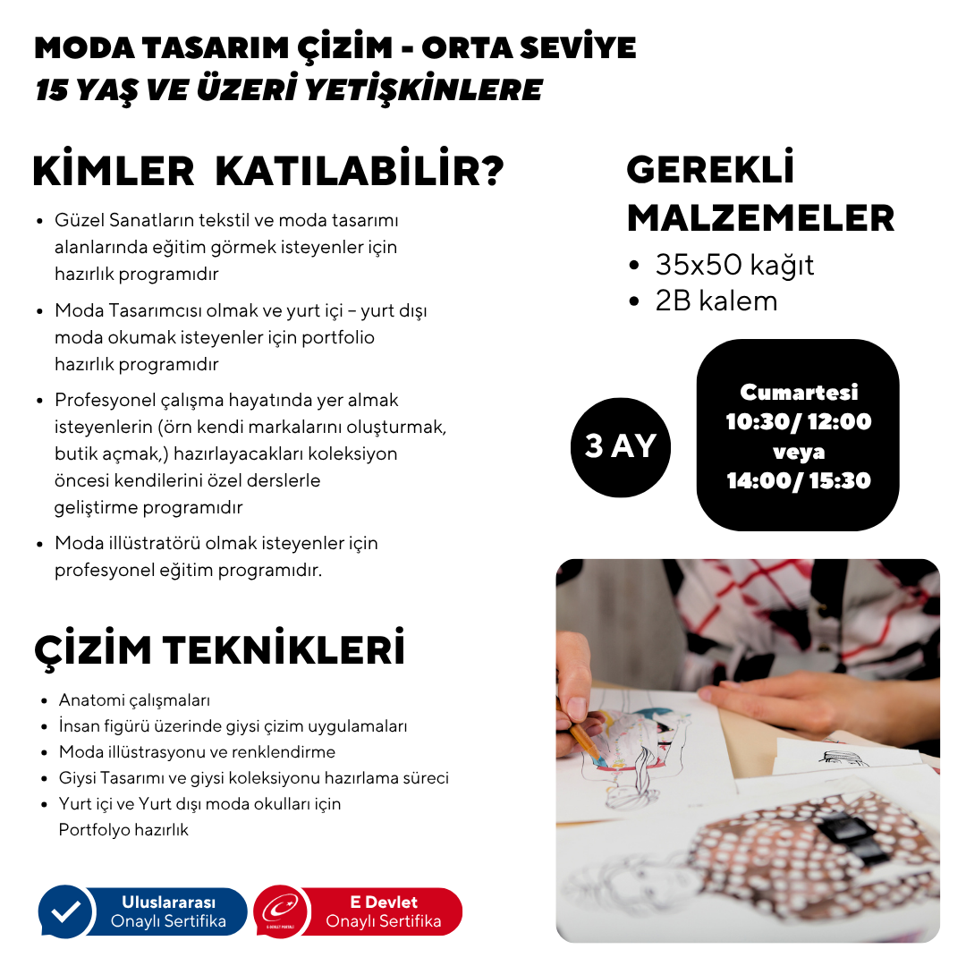 WHAT WILL YOU GAIN? Anatomy studies Clothing drawing applications on the human figure Fashion illustration and coloring Clothing Design and clothing collection preparation process Portfolio preparation for domestic and international fashion schools