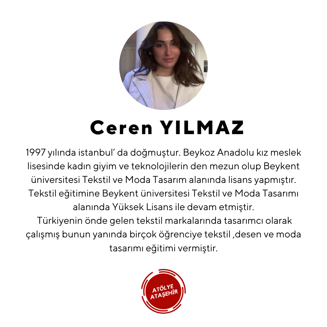 She was born in Istanbul in 1997. She graduated from Beykoz Anatolian Girls' Vocational High School, Department of Women's Clothing and Technologies and completed her undergraduate studies in Beykent University, Department of Textile and Fashion Design. She continued her textile education with a Master's Degree in Textile and Fashion Design at Beykent University. She worked as a designer in Türkiye's leading textile brands and also taught textile, pattern and fashion design to many students.